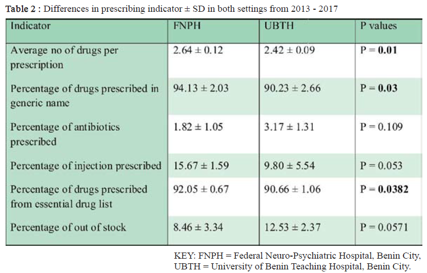 The aims of the study are to investigate the prescribing pattern and its' trend using the WHO prescribing indicators. A retrospective study of outpatient's prescriptions sheets from 2013 to 2017 in both facilities using systematic random sampling. Average number of drugs per encounter, percentage of prescriptions in generic name, percentage of antibiotics, percentage of injection encounter, drugs prescribed from essential drug list and DDD/1000 inhabitants/day were determined. Results obtained were that a total number of 2581 prescriptions from FNPH and 1857 prescriptions from UBTH were collected. Lowest average numbers of drugs per encounter in FNPH was 2.54 in 2014 while that of UBTH in 2014 gave 2.32. Highest percentage of medications prescribed in generic name was 96.67 in 2015 for FNPH and 91.91 in 2013 for UBTH. In FNPH, the number of persons on haloperidol on a daily basis decreased from 10 in 2013 to 4 in 2017, while that of olanzapine increased from 3 in 2013 to 7 in 2017. In conclusion, both facilities fell short of WHO indicators for average number of drugs per encounter, percentage of medicines prescribed in generic name. There was a decline in the prescribing of typical antipsychotics while that of atypical antipsychotics increased in FNPH.